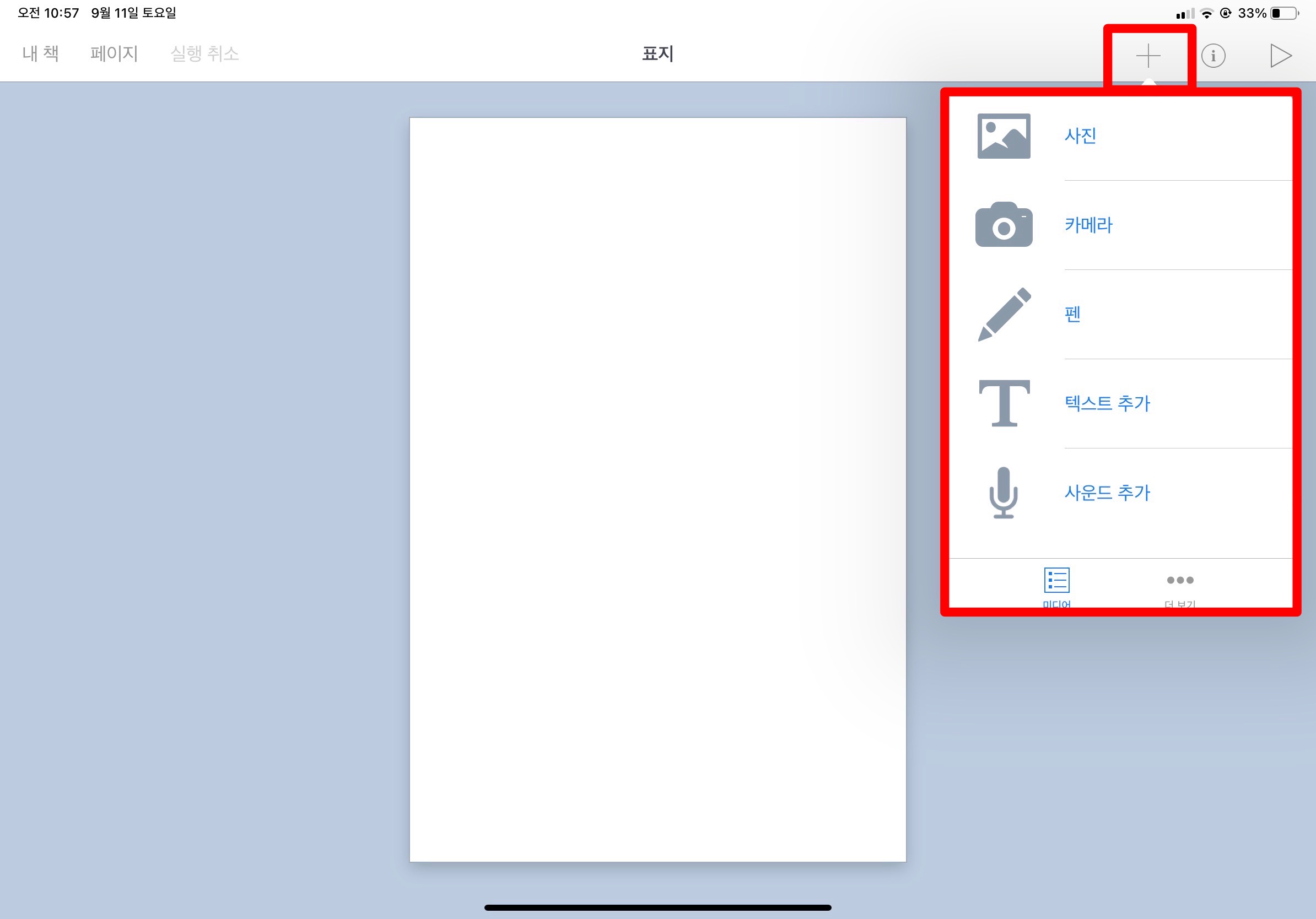 책에 내용을 넣기 위해서는 화면 오른쪽 위의 ‘+(추가하기)’를 터치한다. 아래 그림처럼, 책에 들어갈 수 있는 다양한 요소들을 추가할 수 있다.