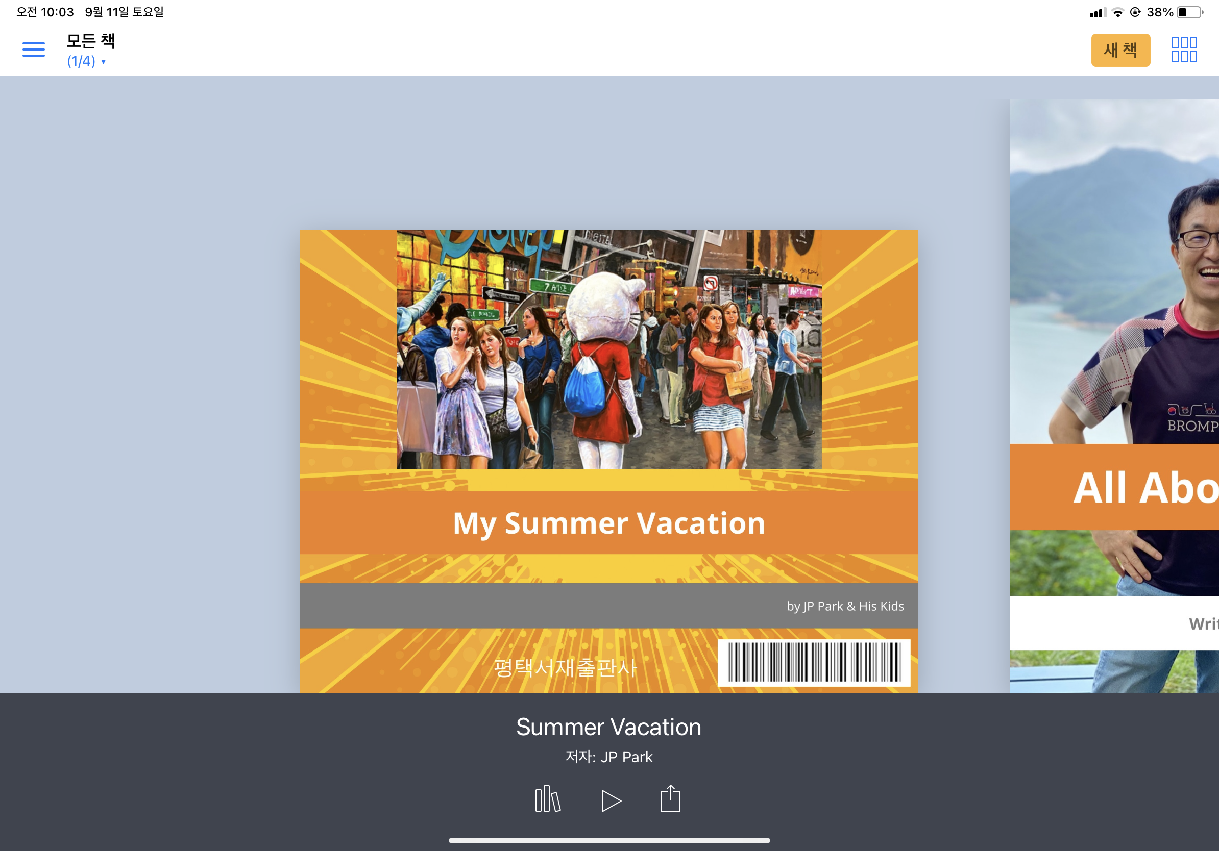 첫 번째 책을 만들어 보자. 아래 화면에서 오른쪽 상단의 ‘ 새 책 ’을 터치하여 선택한다.