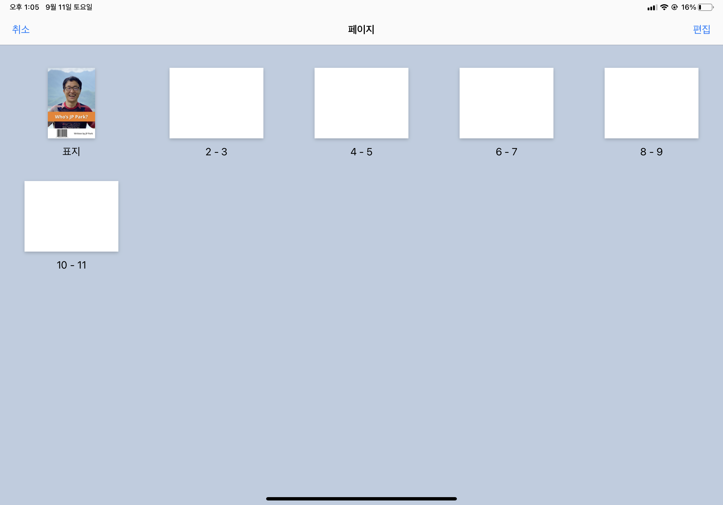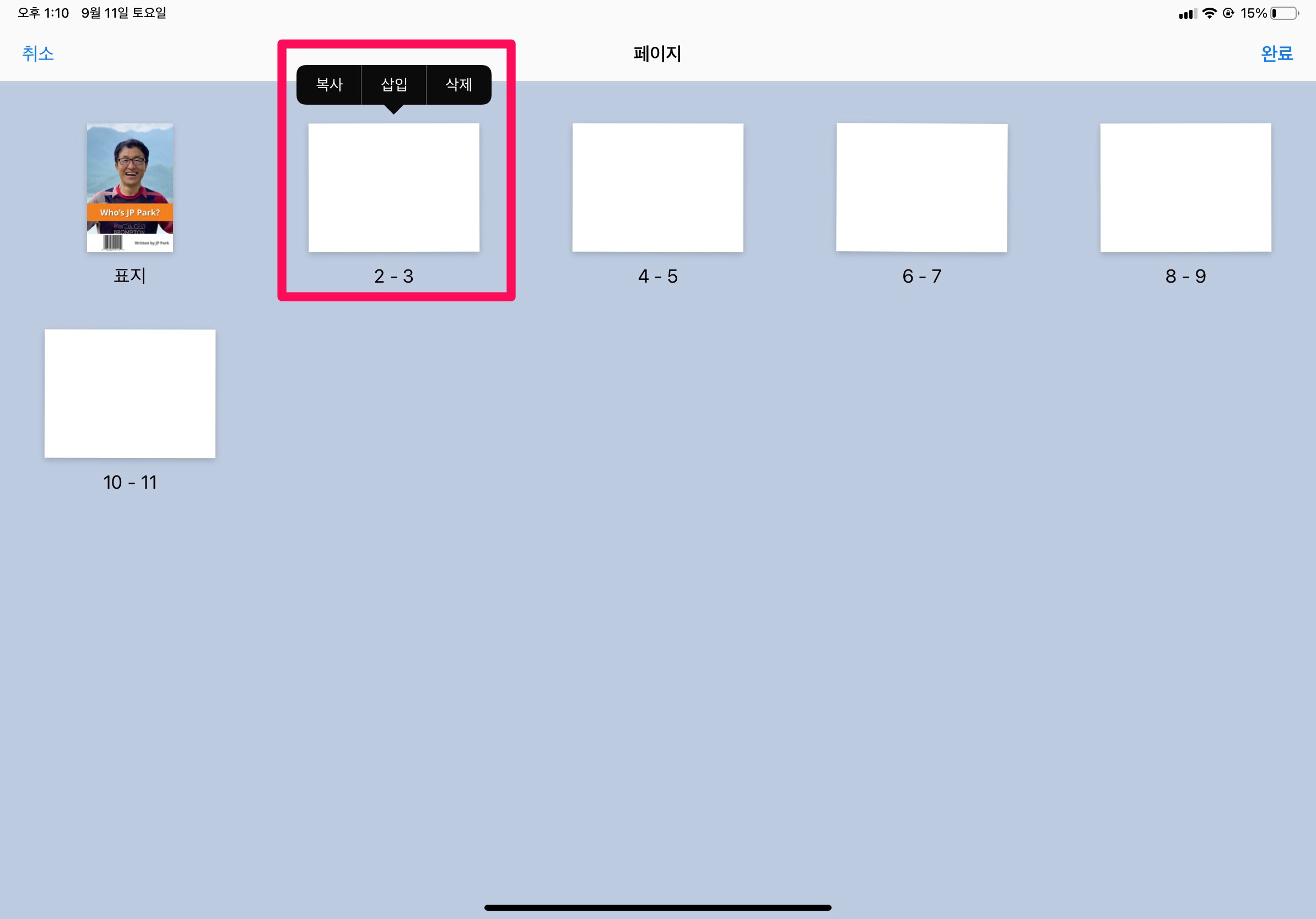 편집하고 있는 책의 페이지가 쭉 보인다. 여기에서 화면 오른쪽 위의 ‘편집’을 누르거나 임의의 페이지를 손가락으로 꾹 누른 후, 페이지를 선택하면 부메뉴가 그림과 같이 나타난다.